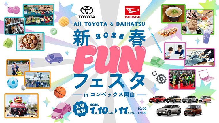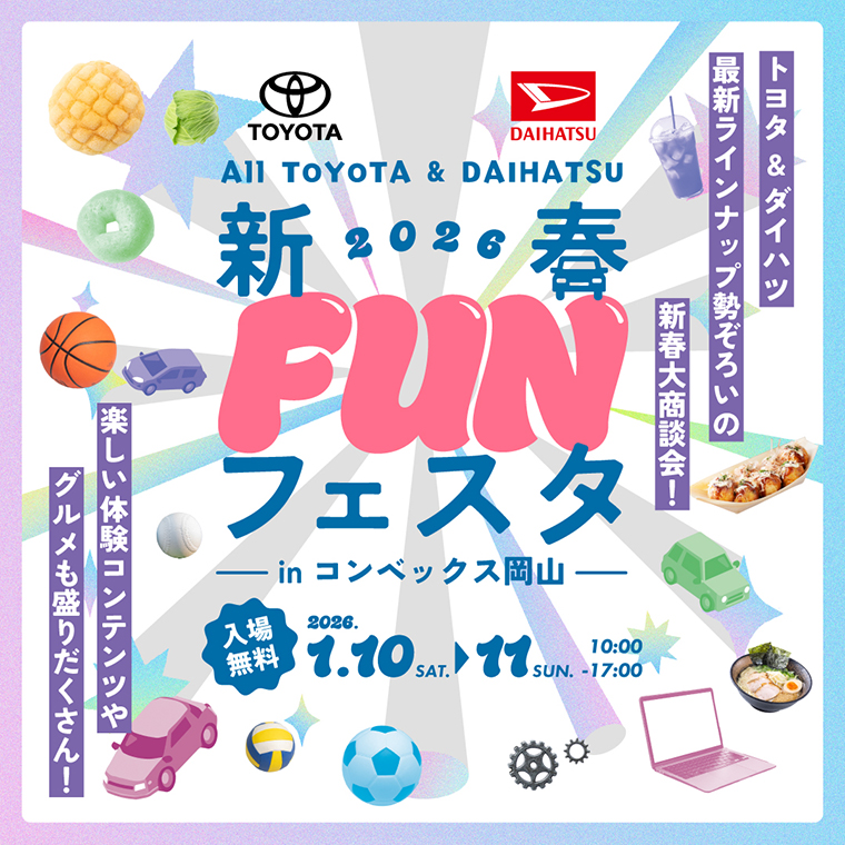 岡山県下の『トヨタ』ディーラーと『ダイハツ』ディーラーによる新春恒例の合同展示・商談会「オールトヨタ&ダイハツ新春FUNフェスタ」が2026年も開催決定。