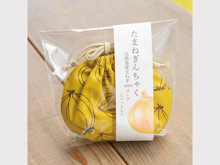 淡路島のハンドメイド作家が作る、オリジナルの玉ねぎ生地をコロンとしたフォルムに仕立てた手作り巾着。「淡路島たまねぎ」を100パーセント使用した、風味豊かな玉ねぎスープ(5本)入り。