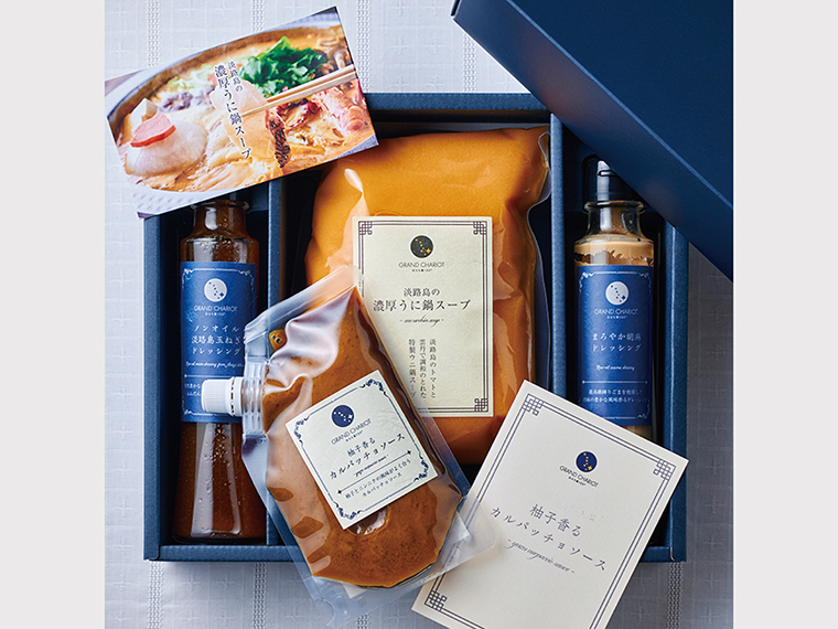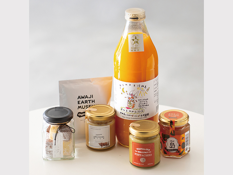 自然体験型ミュージアム『AWAJI EARTH MUSEUM』のショップで販売している淡路島の特産品のセット。地元農家が作る柑橘のジュース、淡路島産の素材を使った加工品など人気商品をセレクト。