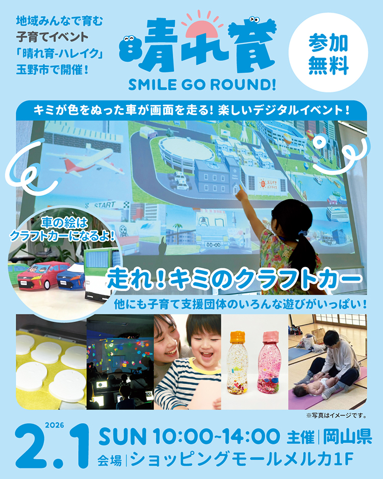 地域みんなで子どもを育むことを目的とした県主催のイベント「晴れ育・ハレイク SMILE GO ROUND!」が、2月1日(日)に玉野市『ショッピングモールメルカ』1階セントラルコートにて開催決定!