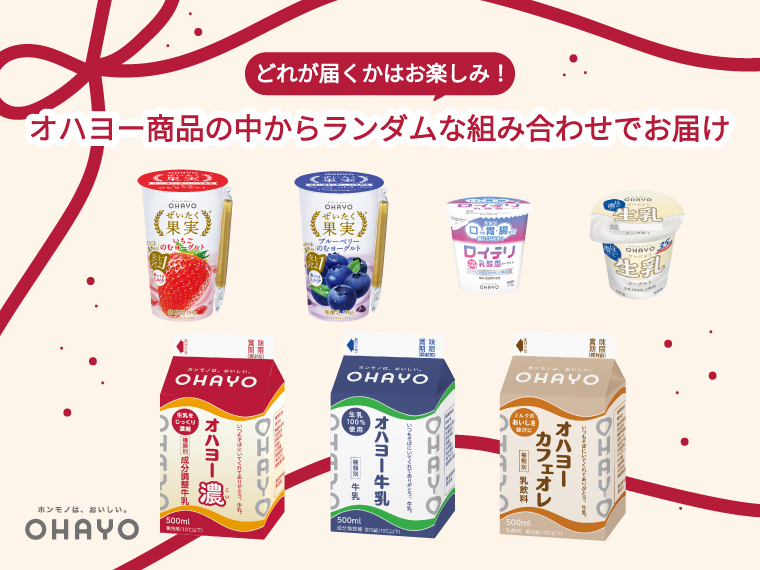 牛乳やカフェオレ、ヨーグルトなど、オハヨー乳業のおいしさとこだわりを集めた詰め合わせギフト。ランダムな組み合わせとなるため、何が入っているかは届いてからのお楽しみ!