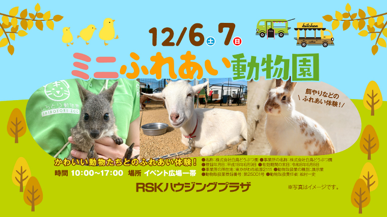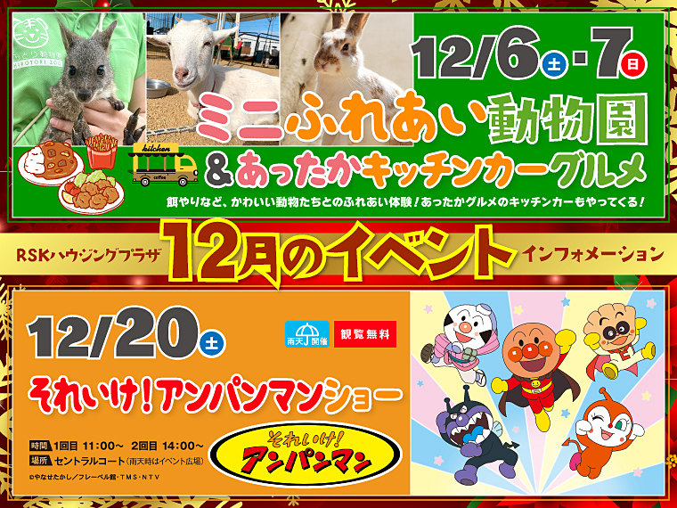岡山市北区『RSKハウジングプラザ』12月のイベントは「ミニふれあい動物園&あったかキッチンカーグルメ」、「それいけ!アンパンマンショー」など。家族みんなで楽しもう。