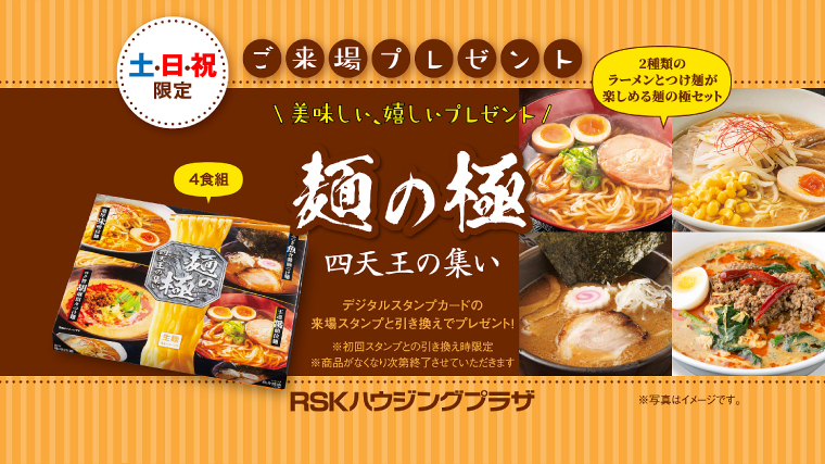 『RSKハウジングプラザ』では、来場が初めての人には素敵なサービスが。 毎月内容が替わるプレゼントとして、12月は「麺の極 四天王の集い」を用意。 デジタルスタンプカードへの登録後、スタンプを獲得しよう。