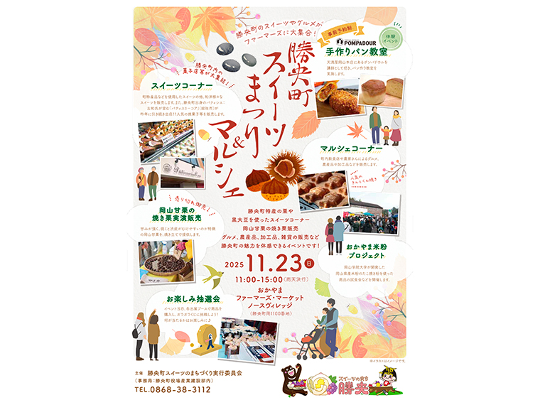 勝央町特産品の黒大豆や作州栗(岡山甘栗)をPRするイベント「勝央町スイーツまつり&マルシェ」が、今年も開催決定! 『おかやまファーマーズ・マーケット ノースヴィレッジ』で11月23日(日)11~15時まで行われる。