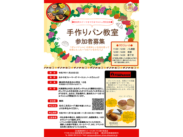 「マルシェコーナー」では、町内飲食店によるグルメや農産物販売、ワークショップなどを企画。人気パン店『ポンパドゥル』オリジナルパンの販売や小学生対象の手作りパン教室(当日受付なし)、勝央町の新名物「岡山甘栗」(焼き栗)の実演販売もあり!