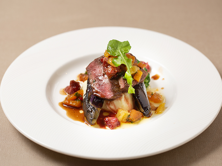 網焼きにしたイノシシの背ロース肉と、秋ナスのコンフィ、イチゴやマンゴー、パイナップルなどの自然な甘みと酸味が効いたフルーツソースの相性が抜群。目にも舌にも華やかな、滋味深いひと品。