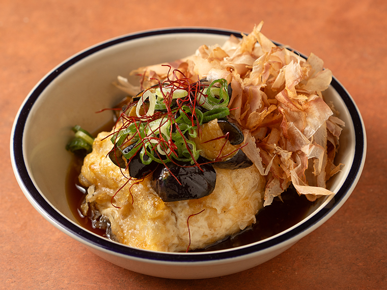 大豆の風味豊かな絹ごし豆腐を、丸々一丁揚げだしに。カツオベースのしょうゆダレで炊いたナスや削り節と味わう、うま味たっぷりの逸品。そのほか地産地消食材を使った「こだわりの肉豆富」900円もスタンバイ。