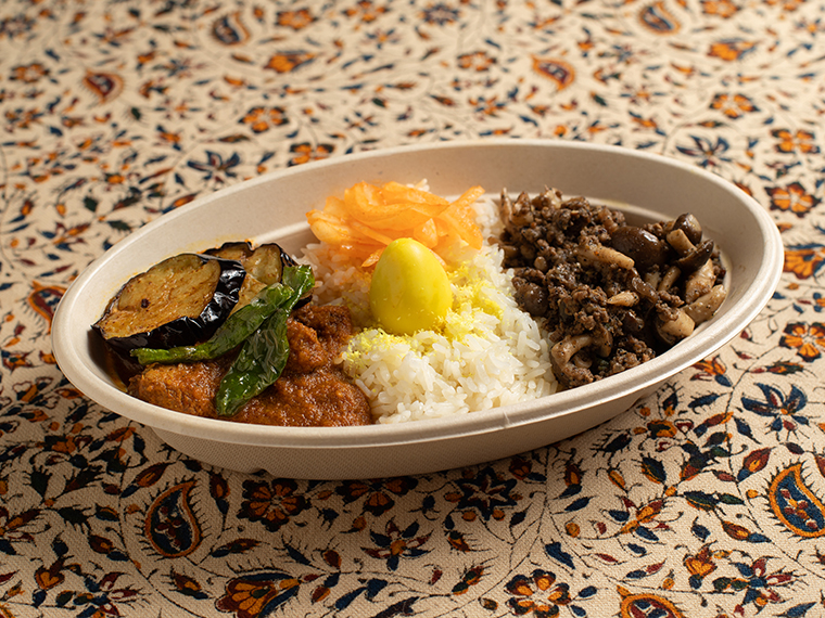 タマネギの甘みが生きた「秋なすのオニオニオンチキンカレー」と、ザクッとした食感も楽しい「ラムひき肉とキノコのネパール山椒キーマ」の2種類がひと皿に。食材のうま味と、香り高いスパイスが存在感を放つ一杯。