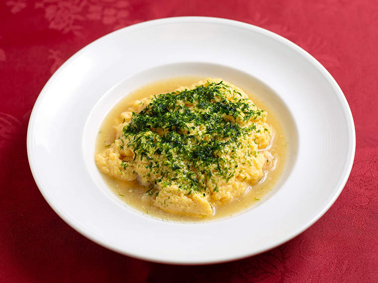 角切りのレンコンとスープで炊いたピラフの上に、ふわふわに仕上げた卵をオン。コンソメスープと青のりをかけてアクセントつけて提供する。熱々のリゾットのような、優しい味わいの一皿。