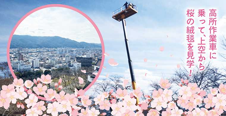 高所作業車に乗って、眼下に広がる桜の絨毯を一望! 各日とも9時30分から本丸会場にて受付開始。雨天、荒天の場合は中止。