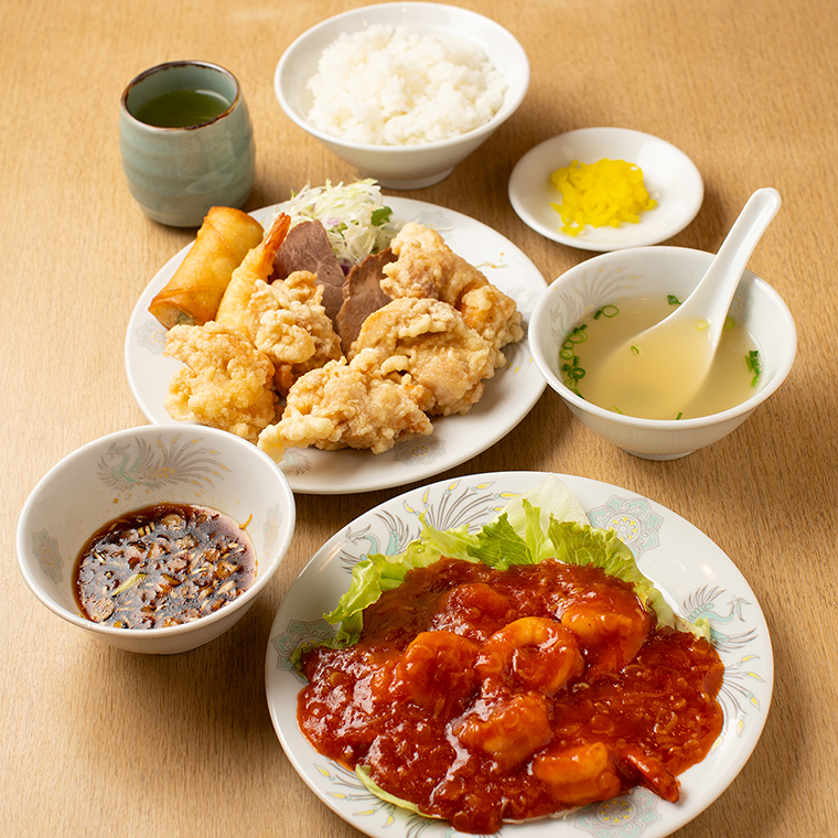 酢豚や八宝菜、エビチリなど4種類から選べるメインに、これでもかと盛られた揚げ物まで付いて満足感抜群。