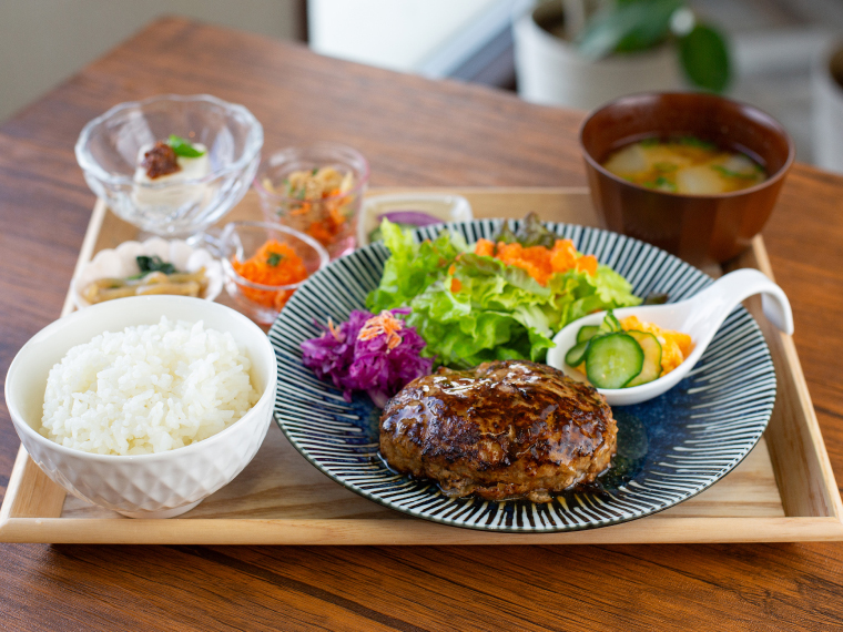 こちらで味わえるのは、ハンバーグをはじめとするメインに、野菜たっぷりのみそ汁や小鉢など、「食べることは生きること、生きることは食べること」をモットーに栄養バランスを考慮した定食ランチだ。