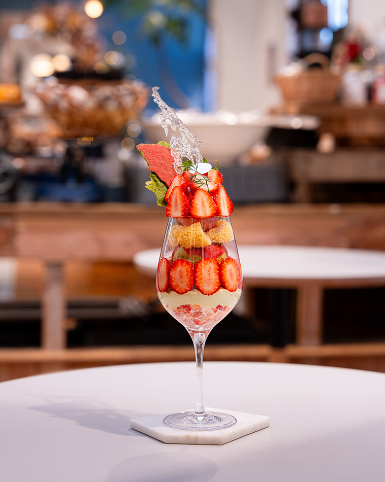 カフェメニューのひとつ、季節のパフェでは「晴苺」をはじめ旬のイチゴをふんだんに使った一杯が登場!