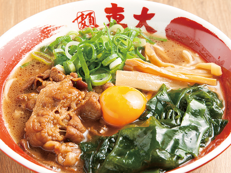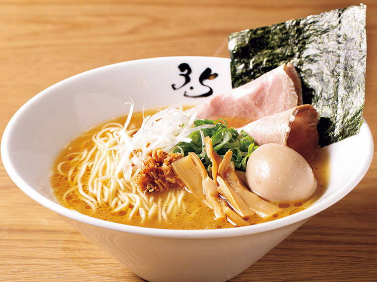 豚骨の豊かな風味とほんのり甘みを感じるだしに、じっくり火を入れたラードを加えたコクのあるスープを楽しめます。合わせるのは、歯切れのよい平打ちの細麺です。