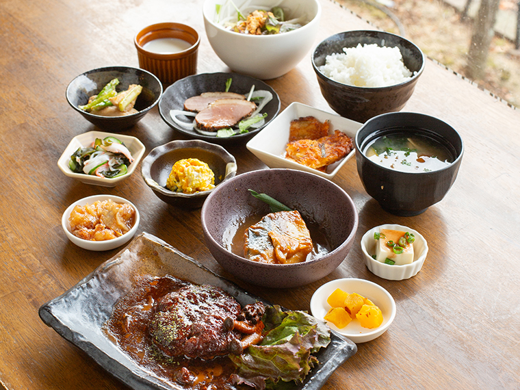 中でも「Wランチ」1300円は、メイン2種類に小鉢4~6種類、カモのカルパッチョ、サラダ、杏仁豆腐などが付いてボリューム満点! メインは週替わりで、この日は「デミグラスハンバーグ」と「鯖の生姜煮」が登場。メインを肉または魚から選べる「週替わりランチ」1000円も用意する。