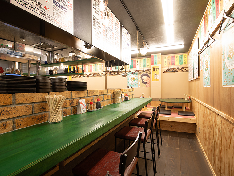 カウンター席がキッチンを囲む、大衆感漂う店内。奥には小上がりの座敷にちゃぶ台が並び、ゆっくりくつろげる。