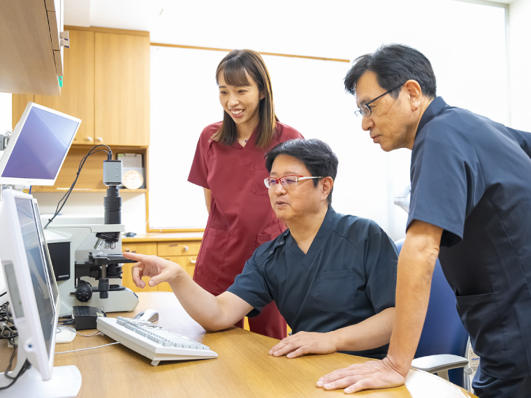 診察時のクールさと時折見せる柔和な笑顔とのギャップにファンも多い、院長の浅桐和男先生(中央)。