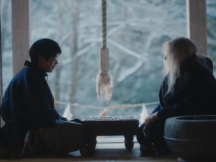 本殿や御神窟、山門から本殿まで続く九十九折りの参道など、老人が妻と暮らす場所として登場します。拝殿で碁を打つ姿はとても印象的です。