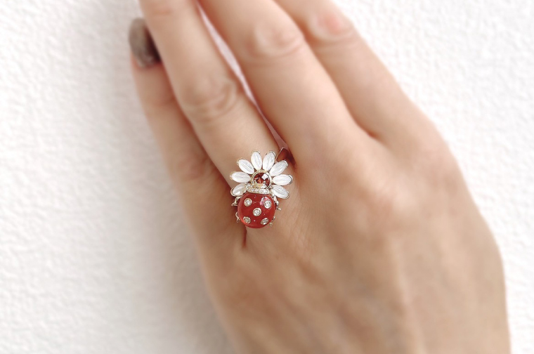 思わず笑みがこぼれてしまう遊び心あるデザインながら、華やかなイエローゴールドのリングに可憐な白蝶貝と鮮やかなカーネリアンの組み合わせが上品で、大人の装いにアクセントを添えてくれそう。