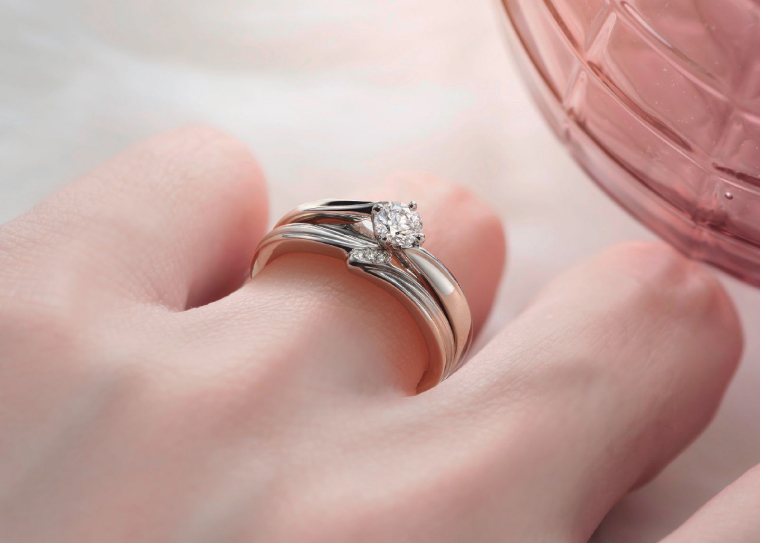 婚約指輪はダイヤの出っ張りが少ないフラット構造なので、日常使いしやすいと、大人の花嫁に早くも人気を集めている。結婚指輪は大空を力強く羽ばたく「雉の翼」をデザイン。マットな光沢の交差するラインは、ふたりの人生が交わる様子を象徴している。