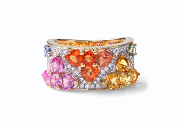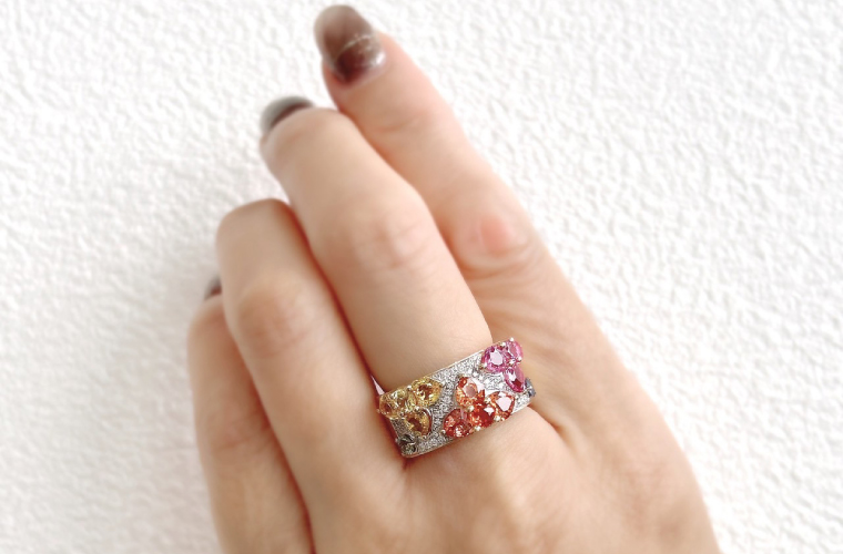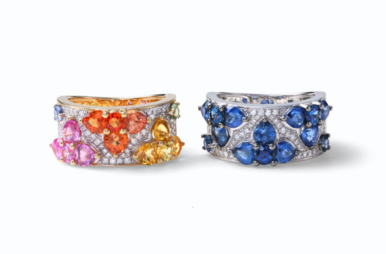 カラー展開は、ピンクサファイアなど色とりどりのカラーサファイアを用いたものと、ブルーサファイアの豊かな青色を引き立たせたものの2種類を用意。
