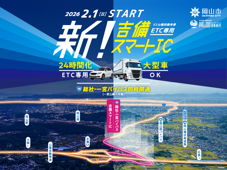 2026年2月1日(日)より、山陽自動車道の吉備スマートインターチェンジ(以下、「吉備スマートIC」)が24時間化&大型車対応となり「新!吉備スマートIC」の運用がスタート! 同時開通となる一般国道180号総社・一宮バイパス(一宮山崎~今岡)と直結することで、利便性がますます高まることが期待される。