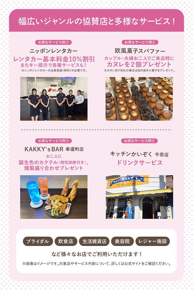 ショップや人気飲食店、宿泊施設、ドラッグストアなど、幅広いジャンルの店舗が協賛店として登録。結婚準備からお出かけまでさまざまな場面で利用できるのが魅力。