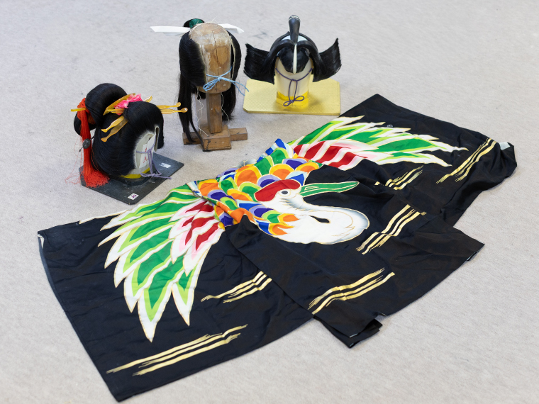 横仙歌舞伎で使用する着物やかつら、小道具の多くは奈義町で保有しているもの。本番当日は仲間同士で着付けを行い、化粧も担当。