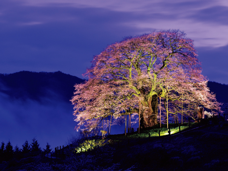 「新日本名木百選」にも選ばれた、県下一の巨木といわれる一本桜。推定樹齢は約1000年、高さ約18m、枝張り東西南北約20mという堂々とした姿で、のどかな山里の丘陵にそびえ立つ。