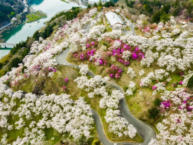 入り口付近に続くサクラのトンネルを抜けると、標高約280mの公園へ。園内に咲きこぼれる約5000本のサクラを楽しめるほか、やわらかな花霞が織りなす旭川ダム湖畔の春景色を見渡すこともできる。早朝に見下ろす雲海の中のサクラも幻想的。